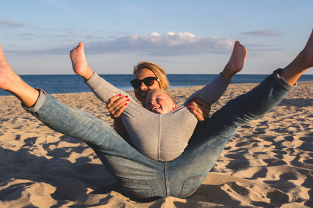 Portrait of young mother with her little son playing on the beach near the sea