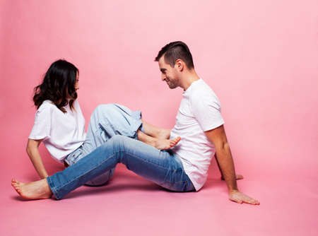 young cheerful caucasian couple together having fun on pink background, guy ang girl modern relationship, lifestyle people concept