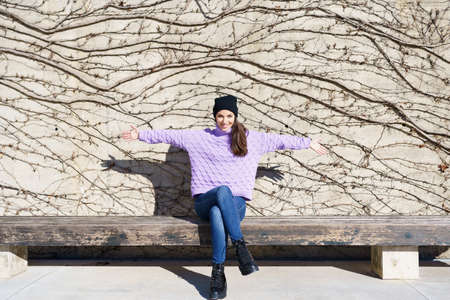 Happy young woman smiling with open arms outdoors.
