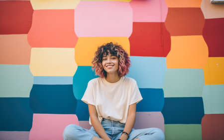 Happy young woman leaning against a colorful wall