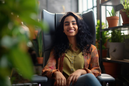 Portrait of a cheerful businesswoman sitting in her office chair, enjoying a moment of relaxation in a modern workspace filled with plants
