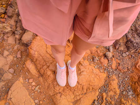Girl with pink dress and shoes standing on a pink ground like in red Mars planet. Madeira island red earth underfoot
