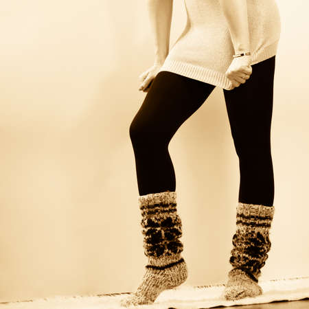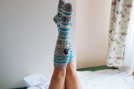 A young beautiful woman in warm handmade knitted clothes at home. . Autumn, Gaiters. Knee socks. Leggings