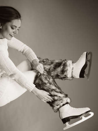 Woman wearing skates fur warm socks. Girl getting ready for ice skating. Winter sport activity. black and white photo