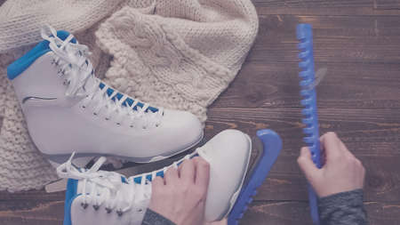Flat lay. Putting on blue blade guards on white figure skates.