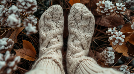 Feet in knitted white socks on the grass and fallen leaves, top view, created with Generative AI technology