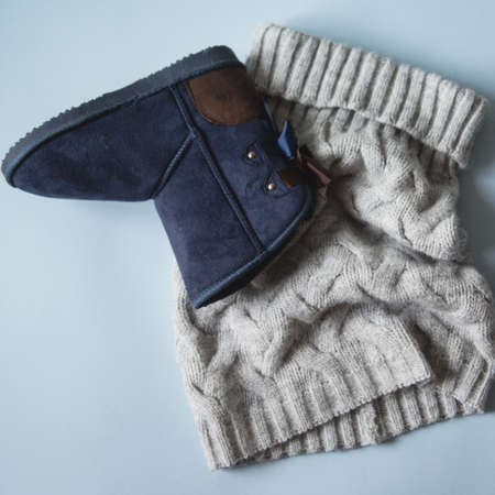 winter boots wrapped with a scarf. Warm shoes in winter. The concept of cold, winter, insulation