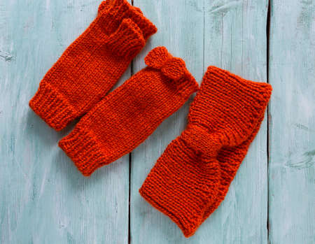 orange hand knitted headband and mittens on wooden surface