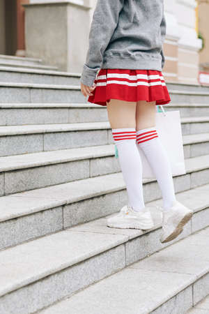 Cropped image of teenage schoolgirl in thigh high socks, short shirt and hoodie standing on steps with shopping-bag
