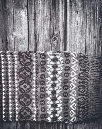 knitted winter sweater on wooden background