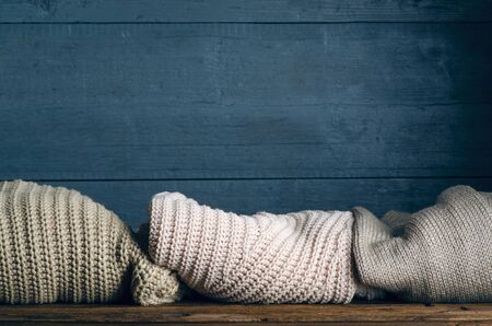 Pile stack folded of knitted warm clothes on wooden background, sweaters, knitwear