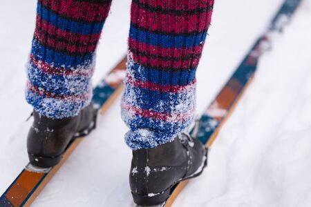 Skier in old leather boots rides wooden skis