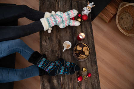 Top view of two women in warm holiday sock sitting wit cup of coffee and cookies on rustic wooden desk.