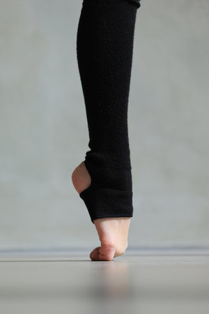 Legs of a ballerina in gaiters indoors