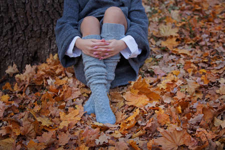 Young girl wrapped her arms around her knees. Girl in gray coat and knitted socks sits in an autumn park. Warm clothes. Yellow autumn leaves. Unrecognizable person. Copy space. Blurred background.