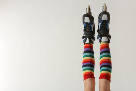 Woman with roller skates on white background, closeup. Space for text