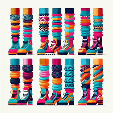 Stacked wool socks with vibrant floral and geometric patterns. A detailed shot of several wool socks displaying vibrant colors. A warm visual