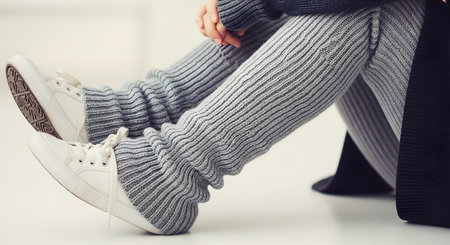 A close-up on the lower legs of a person wearing gray ribbed leg warmers over white sneakers. The person is sitting on a light-colored floor, creating a cozy and casual fashion concept.