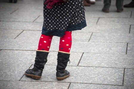 Winter fashion. Woman legs in black pantyhose and stylish fashionable woolen warm socks