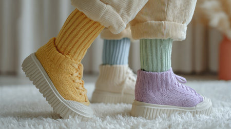 This image captures a close-up of playful colorful knit socks paired with casual sneakers, set against a soft white carpet that enhances the cozy atmosphere.