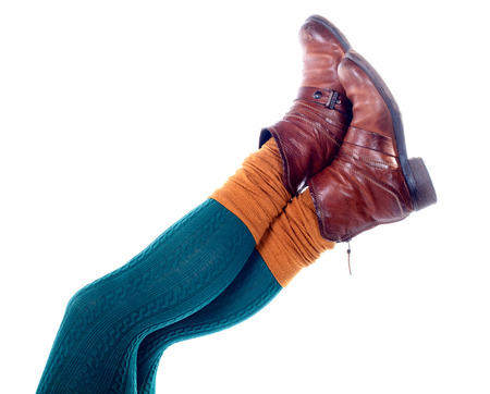 feminine legs with colored tights with shoes on white