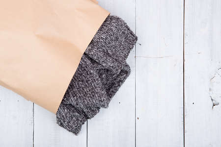 Gray sweater, warm gloves and socks on wooden background. Top view.