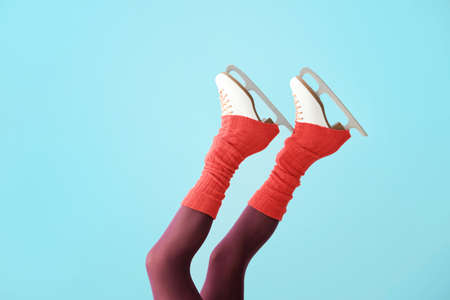 Woman legs wearing skates fur warm socks. Girl getting ready for ice skating. Winter sport activity. Studio shot on blue