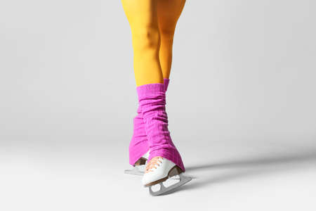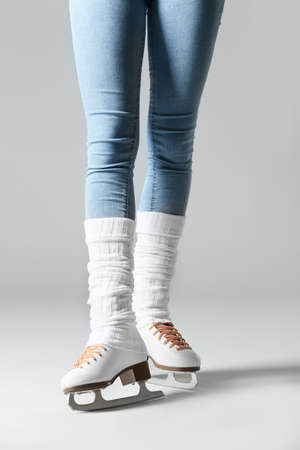 Young woman in ice skate shoes on gray background