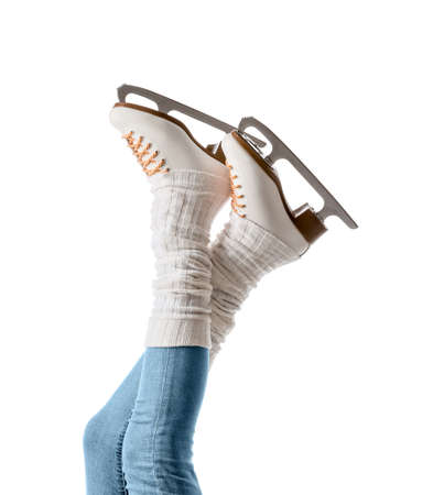 Young woman in ice skate shoes on white background