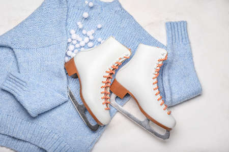Ice skates and warm sweater on light background