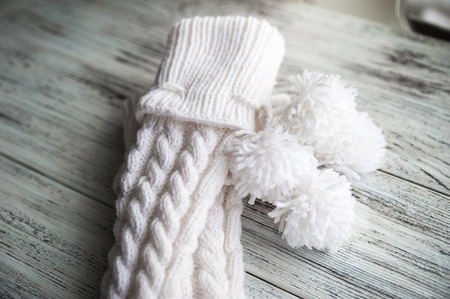 White knitted socks, handmade socks on white background. Texture of knitted things