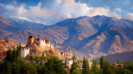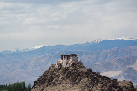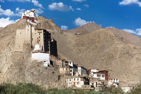 Beautiful landscape view of the ancient Gompa located on a hillock at Shey Palace Monastery, background with sky, clouds in Ladakh, Jammu and Kashmir,India.