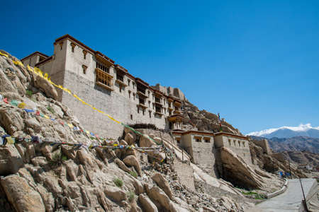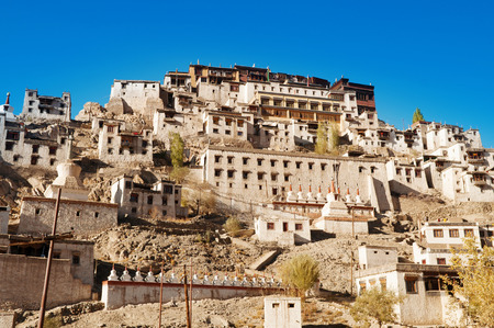 Thiksay monastery with view of Himalayan mountians and blue sky in the background - it is a famous Buddhist temple in,Leh, Ladakh, Jammu and Kashmir, India.
