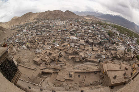 Aerial view of Leh city with mountains background from Leh Palace located in Leh, Ladakh, Jammu and Kashmir, India.