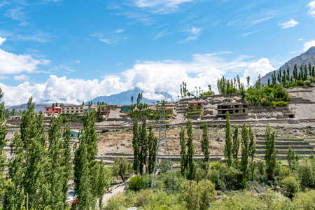 house under tree and moutain in summer from lehcity india