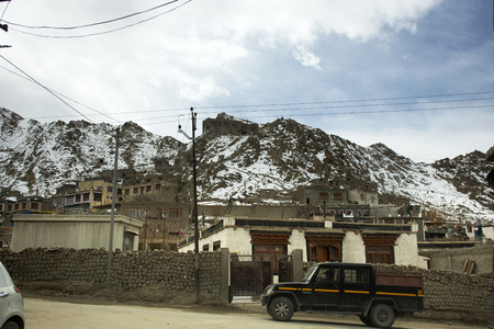 View to a residential area of city of Leh and Namgyal Tsemo Monastery in Ladakh region of Kashmir, India