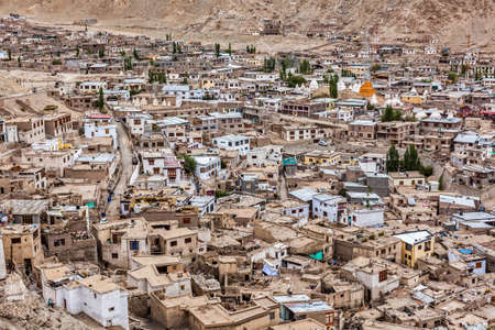 Aerial view of old city of Leh in Ladakh, India. Lah is the historical capital of the Himalayan kingdom of Ladakh, and is located at 3,500 m altitude in the middle of the Himalayan mountain range