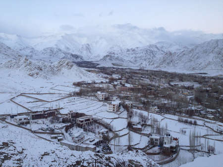 View landscape and cityscape of Leh Ladakh Village with Himalaya mountain range from viewpoint of Leh Stok Palace while winter season in Jammu and Kashmir, India
