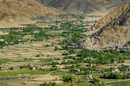 Green agricultural land amongst barren mountains of Leh, Ladakh - image shot from Changla pass. Leh, Jammu and Kashmir, India