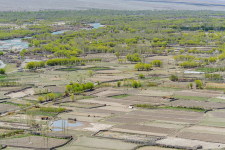 Beautiful landscape with river delta, Tibetian buildings and green trees in Ladakh, Kashmir, view from Thiksey Monastery or Thiksey Gompa.