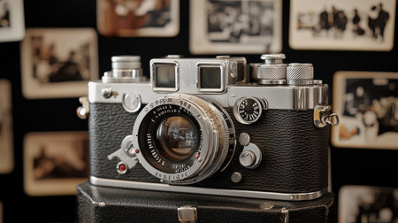 A beautifully detailed vintage camera set against black and white photographs, showcasing the elegance of photography history and craftsmanship in a nostalgic display.