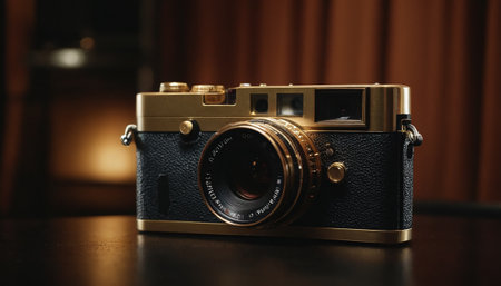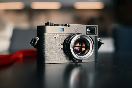 Classic Rangefinder Camera on Elegant Table with Soft Background Bokeh and Vintage Aesthetic