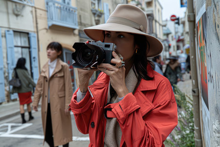 Street fashion female blogger with camera taking a picture. Captivating style, lens focused, fashion in motion.
