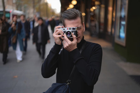 A man stands in the center of a bustling city street, pointing his camera towards the viewer. People walk by as he focuses, creating a vibrant urban atmosphere in the golden hour.