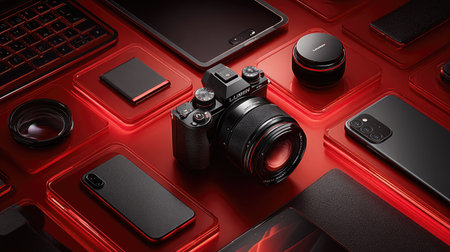 A digital camera sits prominently amidst various electronic devices such as smartphones and tablets. The scene is illuminated with a strong red light, highlighting the sleek black surfaces. The composition suggests a modern, technological theme suitable for advertising and promotional materials.