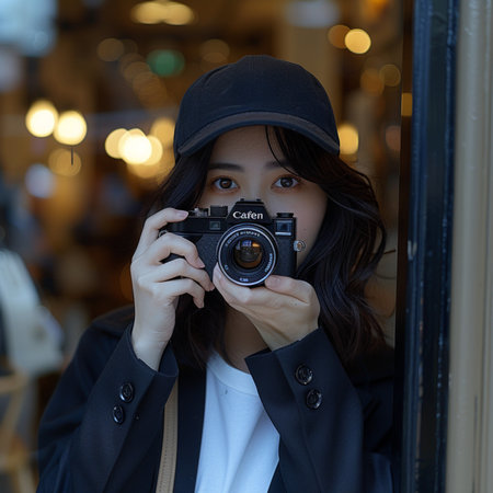 Asian woman sitting in a coffee shop taking a picture with a film camera
