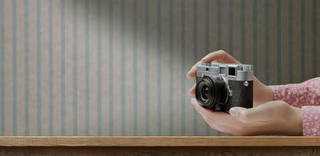 Woman holding a vintage camera and retro wallpaper in the background, creativity and hobbies concept