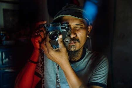Young white man holding a camera. Reportage photography on the street. Selective focus.