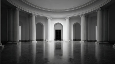 A striking black and white image showcasing an elegant interior with towering columns and glossy reflective flooring. The minimalist design invites calm and contemplation.