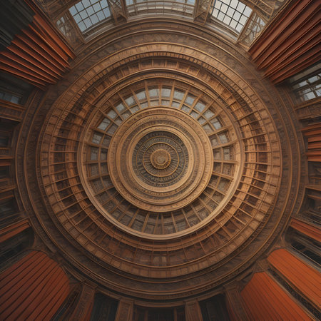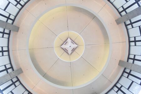 Interior dome ceiling with floral decoration and radial glass windows in symmetrical architectural design for interior inspiration visuals